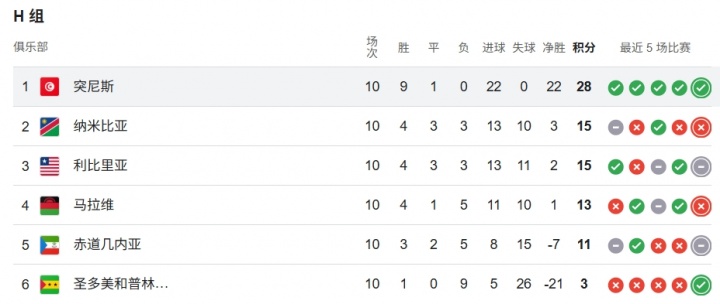 10月13日讯 世预赛非洲区小组赛H组今天结束了最后一轮的全部较量,最终突尼斯以10轮28分,进22球失0球的无解战绩小组第一收官。在本阶段世预赛中,突尼斯除了客战纳米比亚时0-0战平,其他场次全部取胜且一球未失。突尼斯早在第8轮就已经锁定小组第一提前晋级世界杯,他们是非洲区第二支晋级的队伍。